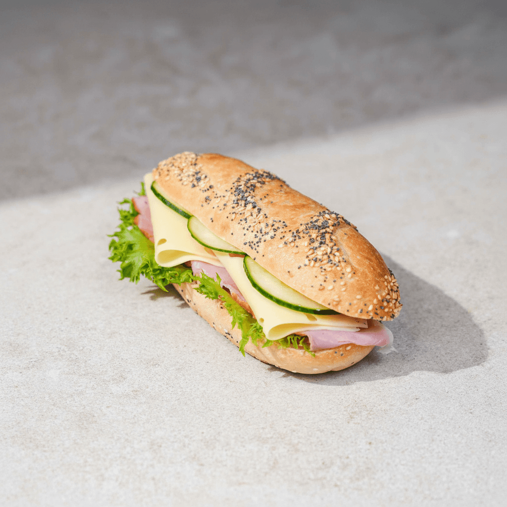 Baguette med ost, skinka & grönsaker