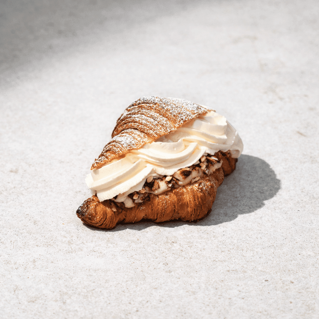 Croissantsemla med mandelmassa, saltrostade mandlar och löst vispad grädde.