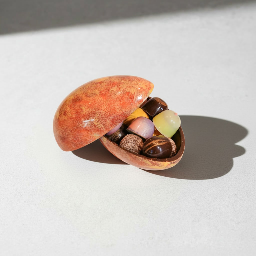 Lyxigt chokladägg fyllt med praliner, marmelad och marsipan.